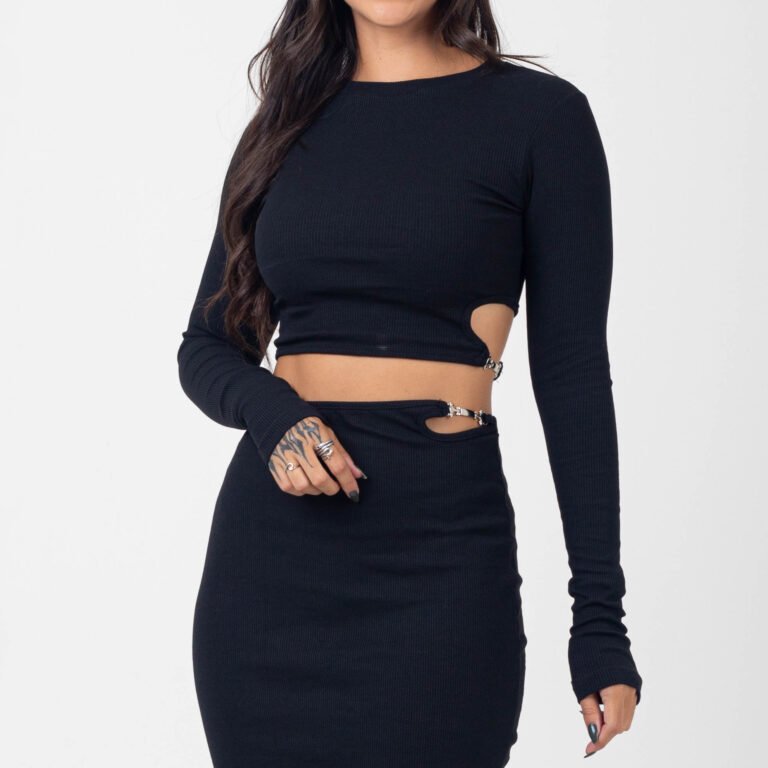 Cropped Manga Longa Canelado com Aplicação em Metal